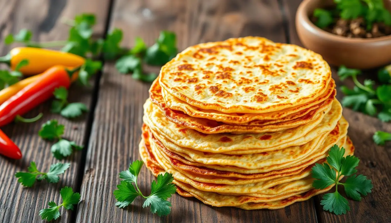Crispy tortillas stacked on a rustic wooden table, golden and perfectly fried, with a light steam rising, surrounded by fresh cilantro and colorful jalapeños, natural lighting enhancing their texture –v 5 –q 2 –ar 16:9, BestWayRecipes